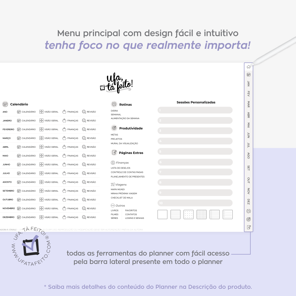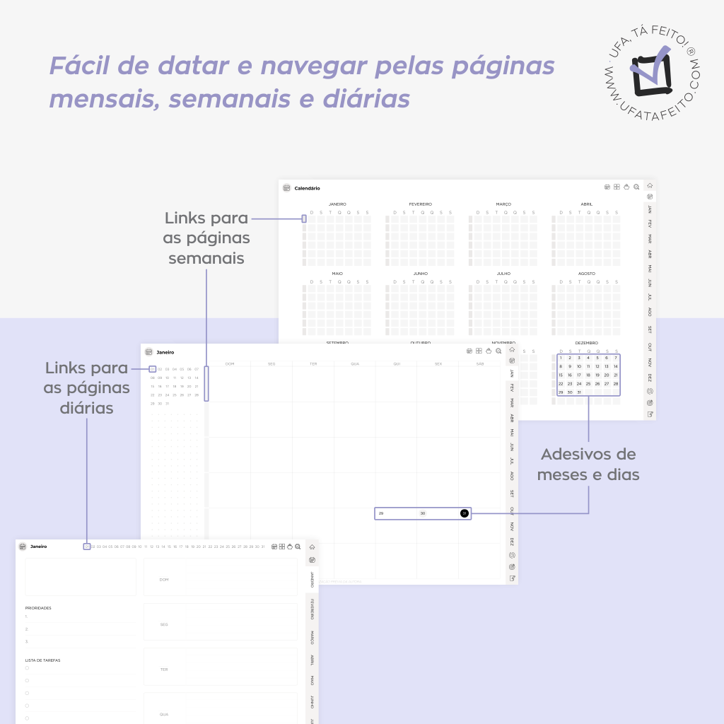 - 1 arquivo de Planner digital na Orientação (Paisagem ou Retrato) escolhida na compra (Em PDF interativo) – todas as páginas possuem links que facilitam a troca de páginas. Inclusas as versões com Início no domingo e Início na Segunda.