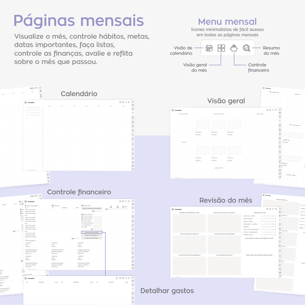 - Visão geral do mês (Datas importantes, Checklist, Hábitos com legenda de cores e metas)